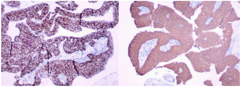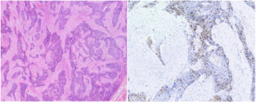Figure 8 Pathological findings of a case of lacrimal carcinoma(H&E staining ×100, Immumohistochemical staining ×200)