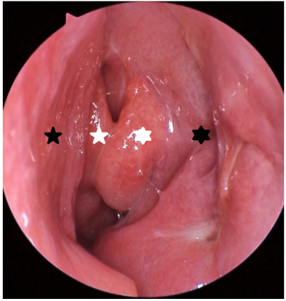 左侧鼻腔呈术后改变,黏膜愈合好,未见复发征象黑色五角星:正常的鼻中隔;黑色六角形:鼻腔外侧壁呈术后改变,局部凹陷,钩突已经在术中大部去除;白色五角星:中鼻甲;白色六角形:筛泡。The left nasal cavity exhibits postoperative changes with well-healed mucosa and no signs of recurrence. Black five-pointed star: normal nasal septum; black hexagon: the lateral wall of the nasal cavity shows postoperative changes with localized depression, and the uncinate process has been largely removed during surgery; white five-pointed star: middle turbinate; white hexagon: ethmoid bulla.