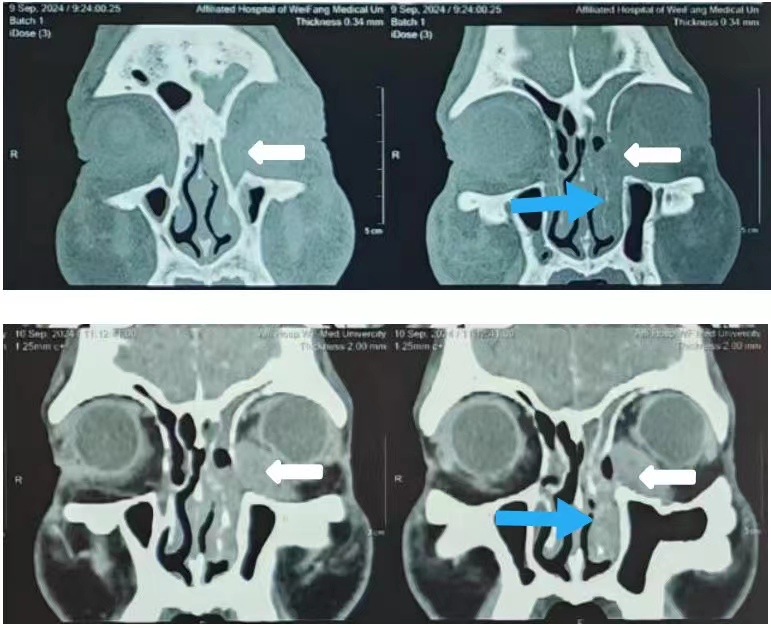 左侧泪囊鼻泪管内异常密度影(白箭头);左侧骨性鼻泪管增宽(蓝箭头)。Abnormal density shadow in the left lacrimal sac and nasolacrimal duct (white arrow); Widening of the left bony nasolacrimal duct(blue arrow).