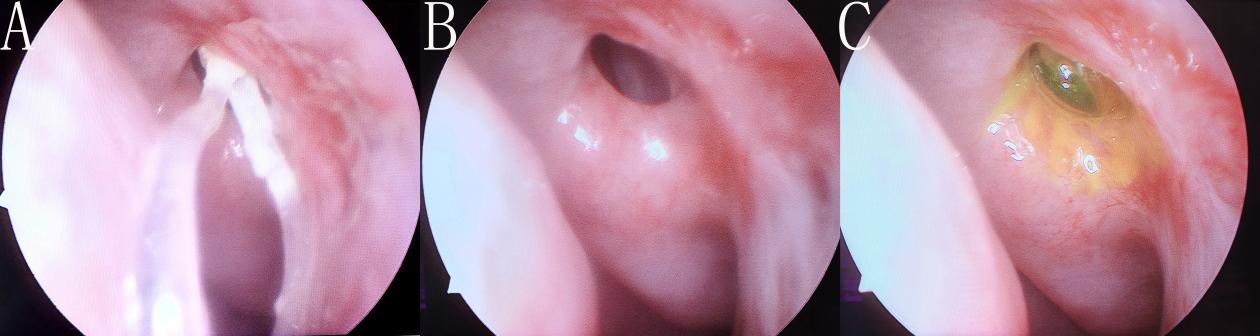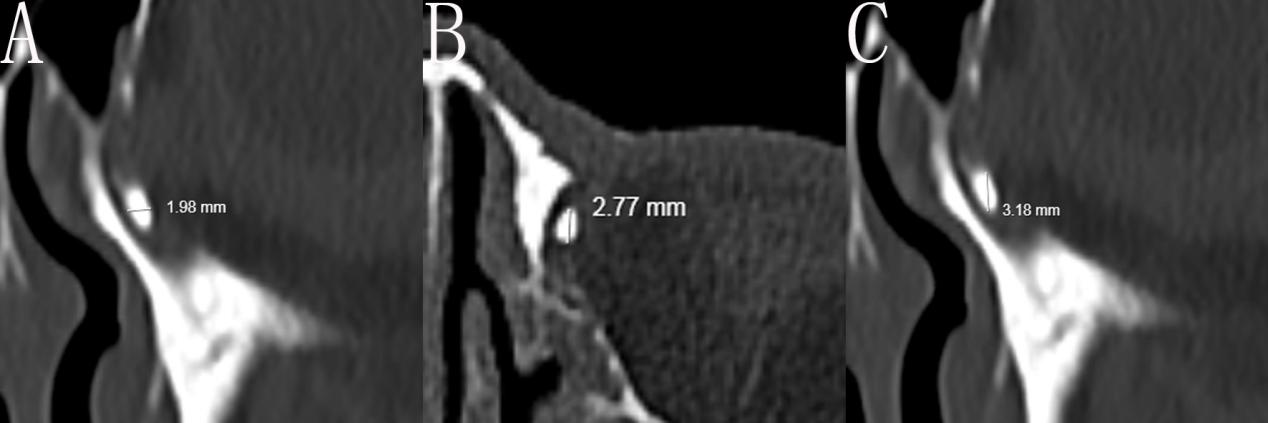 本研究对2020年7月—2023年3月于温州医科大学附属眼视光医院眼眶眼整形微创中心接受En-DCR联合BSTI术式治疗的单眼小泪囊型慢性泪囊炎患者进行了回顾性分析,共纳入69例(69眼)病例。所有患者术前均完成完整的术前眼科检查、泪道专科检查(泪道冲洗、泪道探针探查)、鼻内镜检查、CT-DCG影像学检查。手术过程中采用的人工泪管均为双管人工泪管,即人工泪管两端经过上下泪小管从泪囊鼻腔吻合口植入鼻腔,人工泪管两端从鼻腔取出后打结,最后放置于鼻腔内。本研究通过温州医科大学眼视光医院医学伦理委员会(伦理批件号:2023-065-K-53)批准,遵循赫尔辛基宣言(2008年版)。所有患者均知情同意参与本研究。纳入标准:通过病史、泪道冲洗和泪道探针探查诊断为单眼慢性泪囊炎,同时通过CT-DCG确定为小泪囊并选择接受En-DCR手术治疗的患者:患者有溢泪溢脓病史;泪道冲洗提示下泪道阻塞;泪道探针从泪小管通过泪总管可进入泪囊。